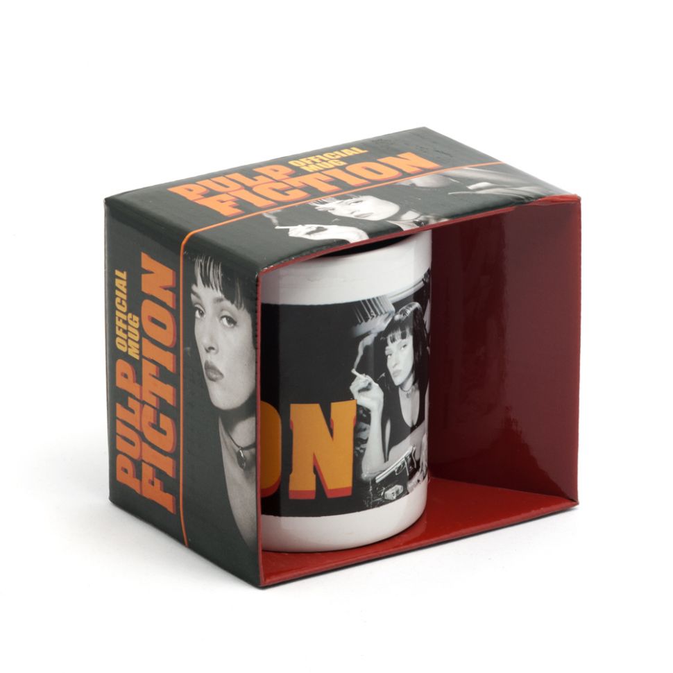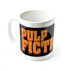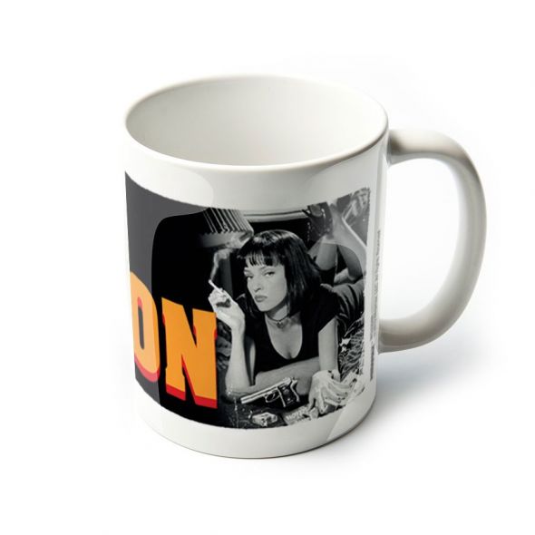 Z daleka zwróci Twoją uwagę nadruk na ceramicznym kubku gdzie w pomarańczowym kolorze widnieje tytuł amerykańskiego filmu z gatunku czarnej komedii pod tytułem "Pulp Fiction". Pomarańczowy tytuł amerykańskiego gangsterskiego filmu "Pulp Fiction" i piękna czarnowłosa kobieta leżąca na łóżku z papierosem w ręku widniejący na nadruku porcelanowego kubka wzbudzają ogólne zainteresowanie. Kobieta ta to Mia Wallance, żona gangstera Marsellusa Wallance'a. Kubek ten będzie cennym nabytkiem dla osób lubiących filmy sensacyjne i czarną komedię.