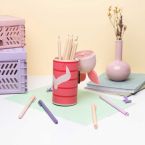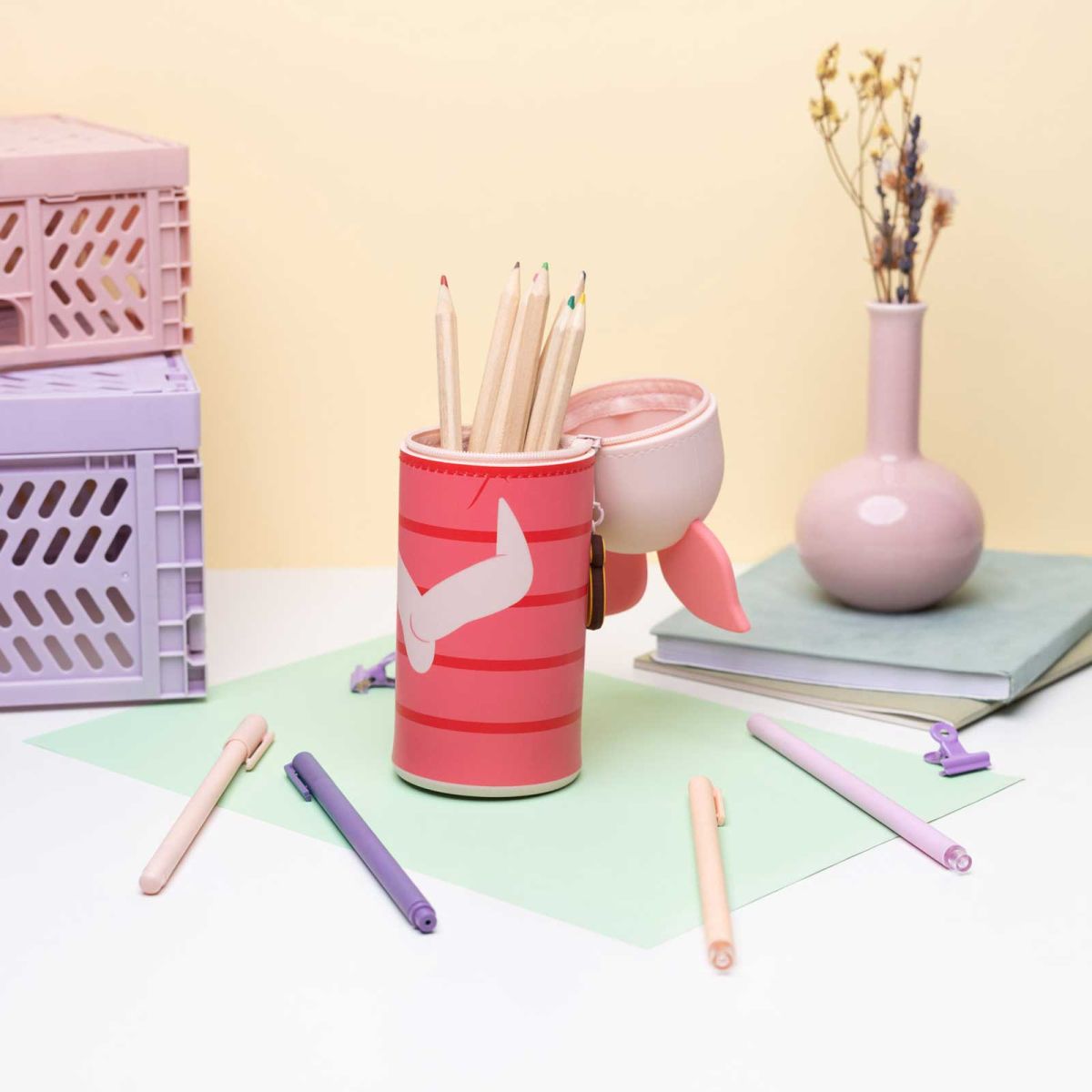 Model ma zamek błyskawiczny z ozdobnym uchwytem, a jego dolna część jest rozszerzana, co zwiększa pojemność i pozwala wygodniej przechowywać przybory.
