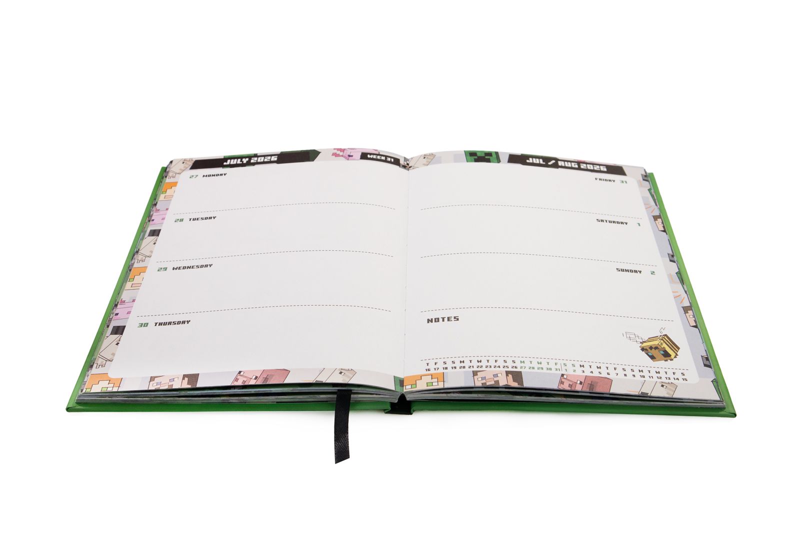 Zorganizuj rok w stylu Minecrafta dzięki kalendarzowi książkowemu A5 „Minecraft 2026”. Solidna, twarda okładka z motywem bloku i postaciami (Steve, Creeper) od razu przyciąga wzrok. Tygodniowy układ z miejscami na cele, zapiski i adresy sprawia, że planowanie staje się przygodą. Papier premium i ekologiczne wykończenie czynią go idealnym prezentem - doskonałym na urodziny, święta i codzienne misje!