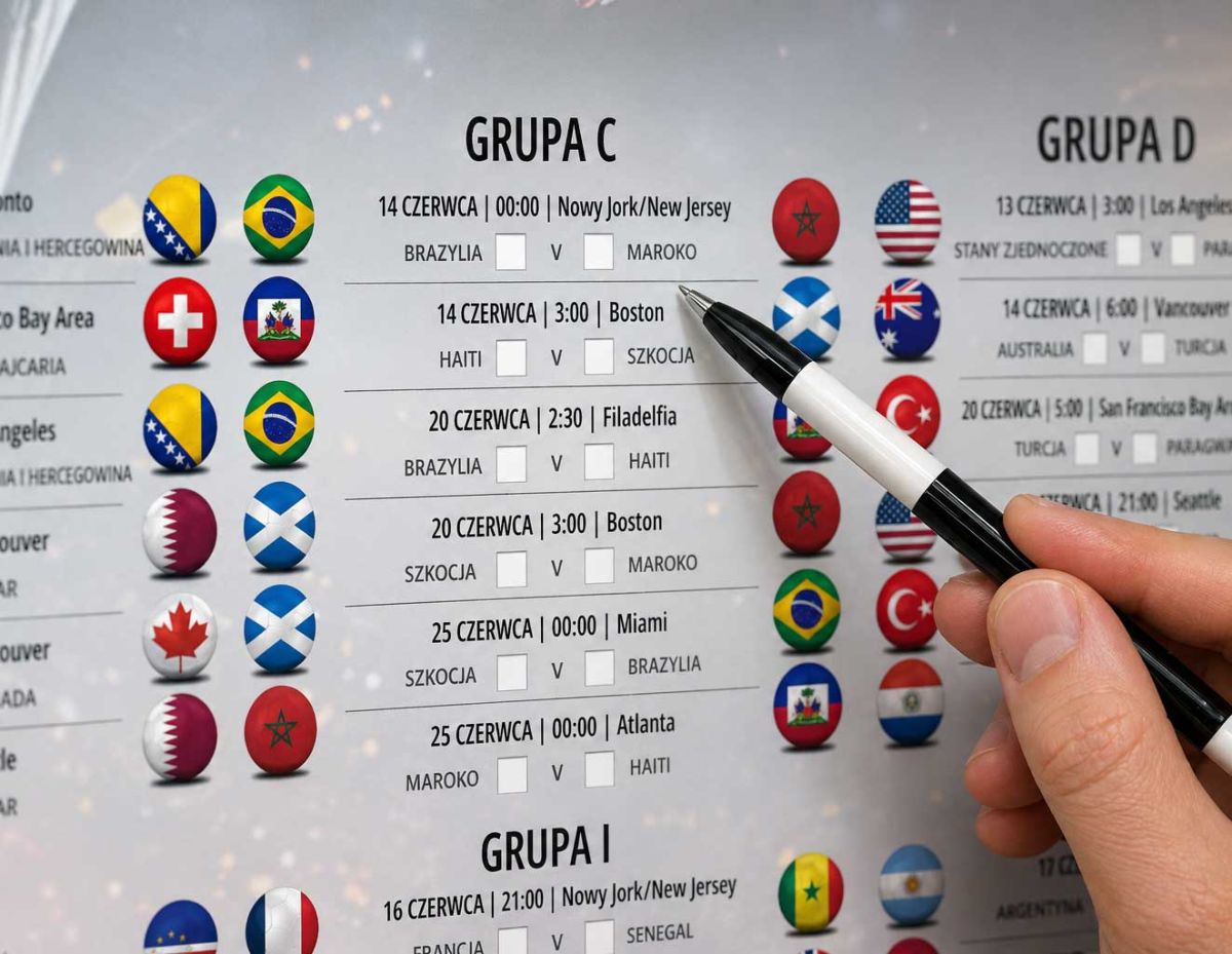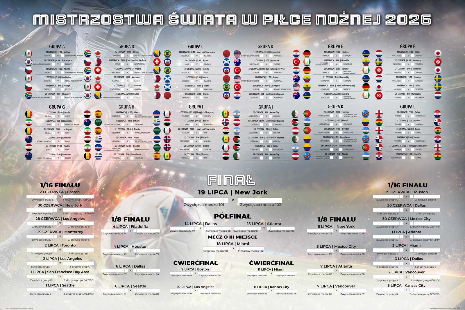 Plakat z tabelą Mistrzostw Świata 2026 terminarz rozgrywek