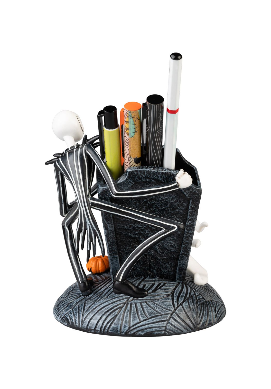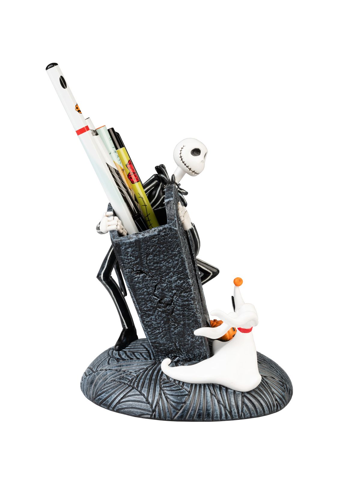 Dla fanów Tima Burtona i kultowego "Miasteczka Halloween" ten zestaw to spełnienie estetycznych marzeń! Trójwymiarowy pojemnik na długopisy przedstawia Jacka Skellingtona, Zera i nagrobek – całość została wykonana z żywicy i ręcznie pomalowana z dużą dbałością o detale. Idealnie sprawdzi się jako niebanalna dekoracja biurka oraz praktyczny organizer. W komplecie znajduje się także zestaw przyborów: dwa długopisy (z niebieskim i czarnym tuszem), ołówek, temperówka i gumka – wszystko w pełni dopasowane stylistycznie do reszty. To doskonały prezent dla każdego fana filmu, który ceni sobie oryginalny design i funkcjonalność w jednym.