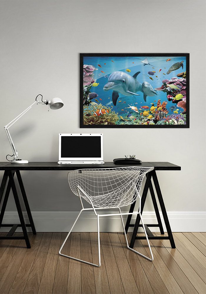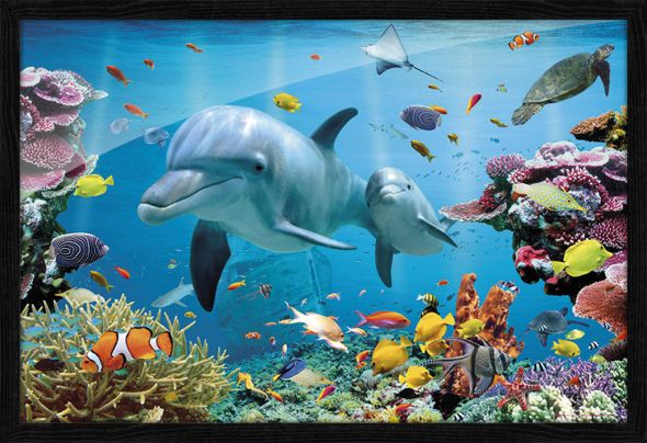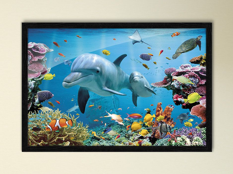 Obraz oprawiony w ramę drewnopodobną pod tytułem Tropikalny ocean - Delfiny - obraz.